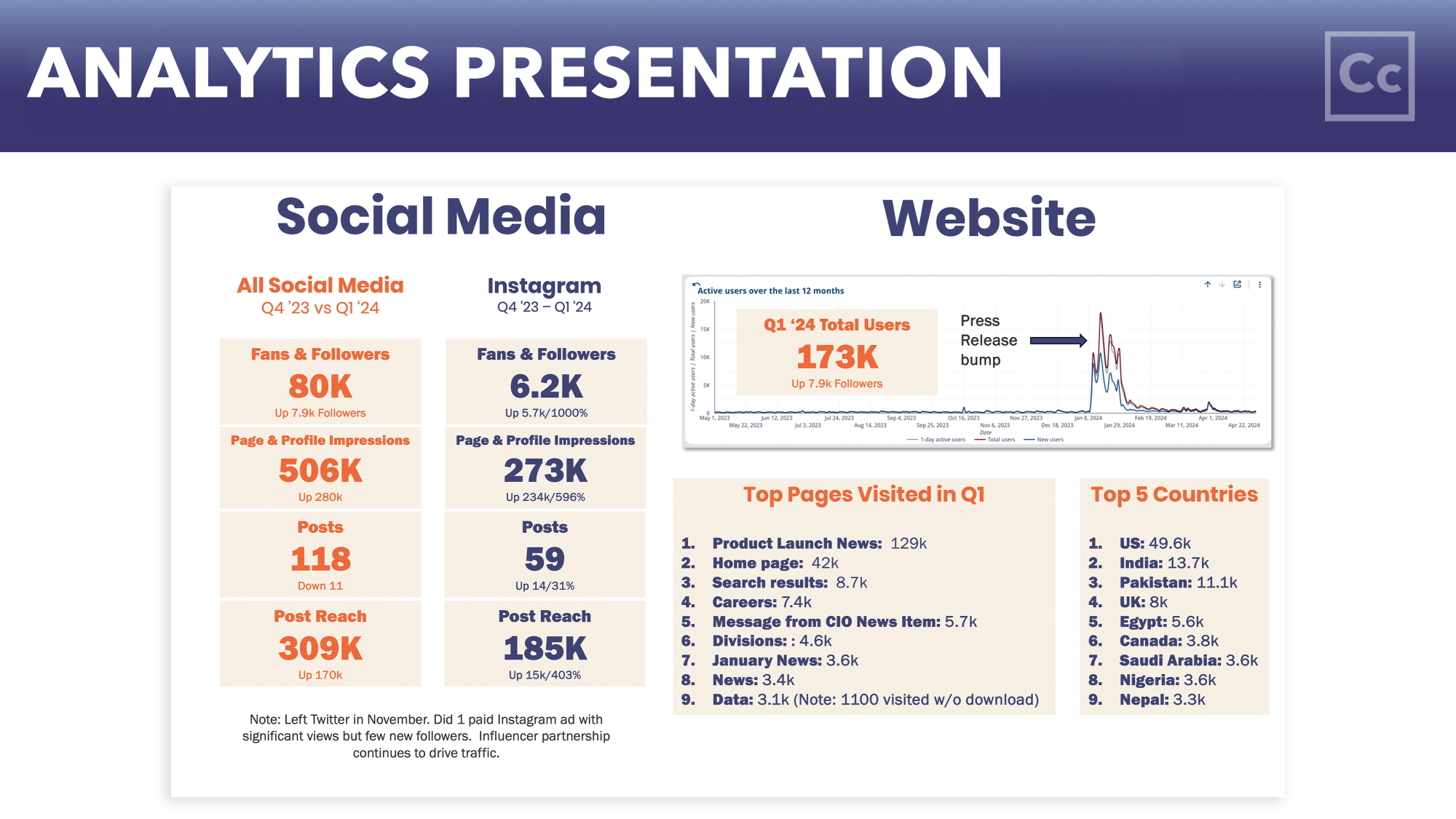 I believe that there no useless analytics however depending on your business, some are much more important to others. This was a quarter's worth of web and social media statistics for presenting at a company-wide presentation. Anyone can export a spreadsheet but just as important is how you tell, and show, the story.