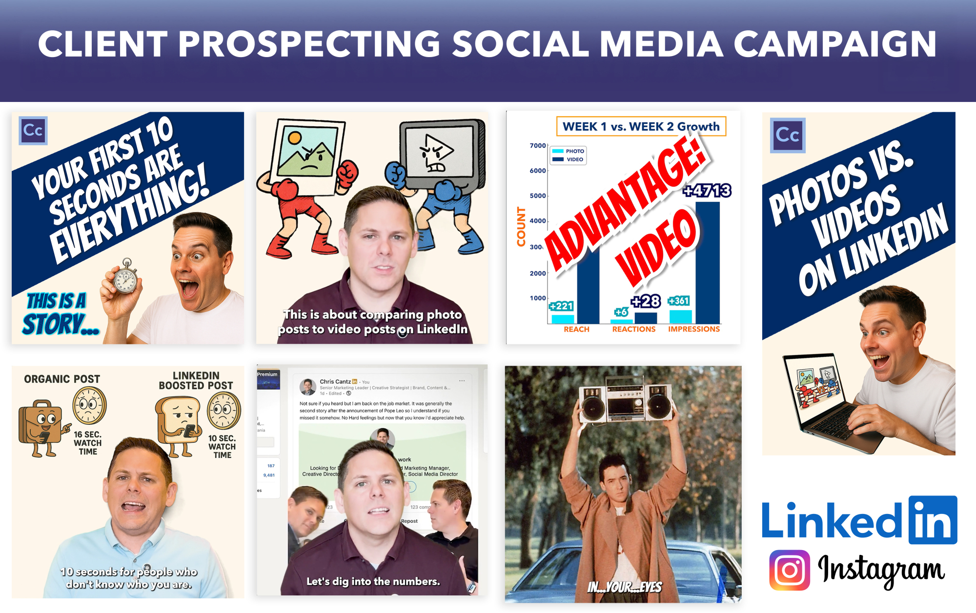 Upon hitting the job market, I wanted a way to announce to my network that I was a free agent. Rather than a simple text post, I created a multimedia series on LinkedIn for self-promotion. In addition to advertising for myself, I also wanted to develop a case study with measurable analytics: would photo or video posts have more reach on LinkedIn?THE RESULTS